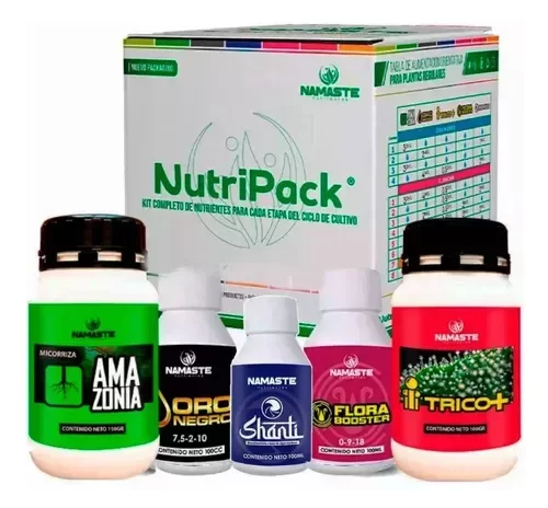 El kit completo de Namaste, incluye instructivos y todos los fertilizantes necesarios para el desarrollo óptimo de las plantas.